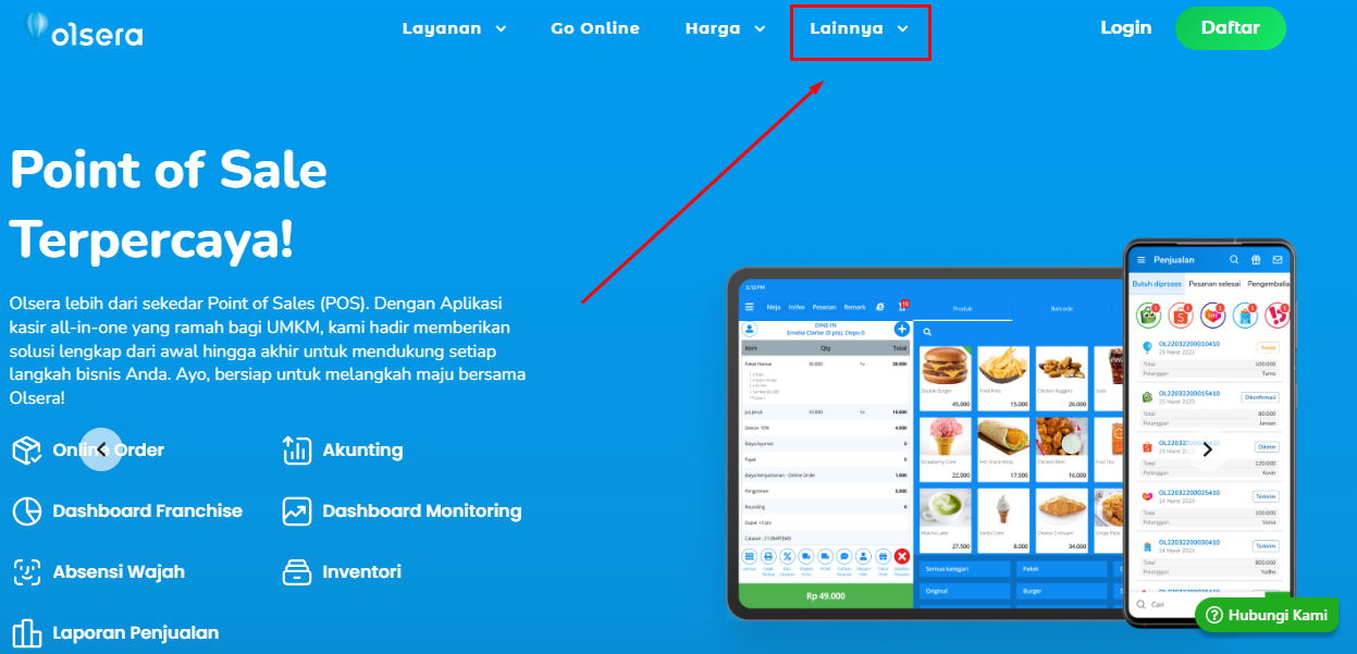 Masuk ke website www.olsera.com > Pilih "Lainnya" > Pilih "Unduh" atau bisa tekan pada link download berikut : Download Olsera POS