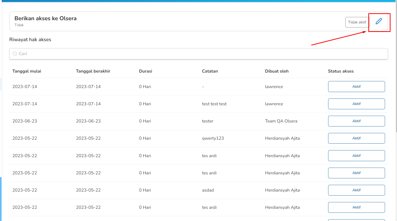 Pada halaman Akses Support, temukan ikon pensil di sebelah kanan dan klik untuk mengedit akses support.