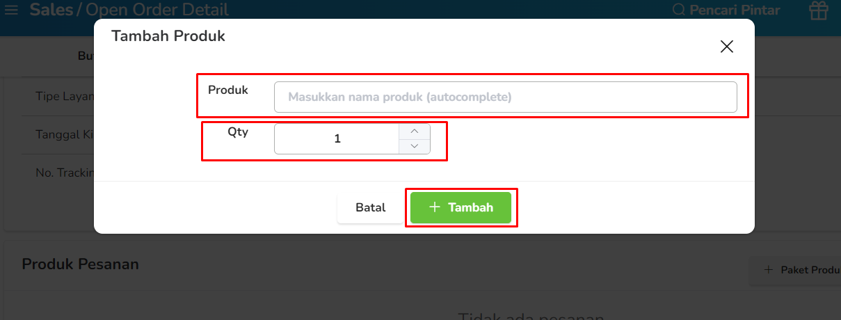 Setelah mengisi detail transaksi, tambahkan produk yang dijual pada menu Produk Pesanan. Anda bisa memilih produk atau paket sesuai dengan penjualan yang sedang dibuat.