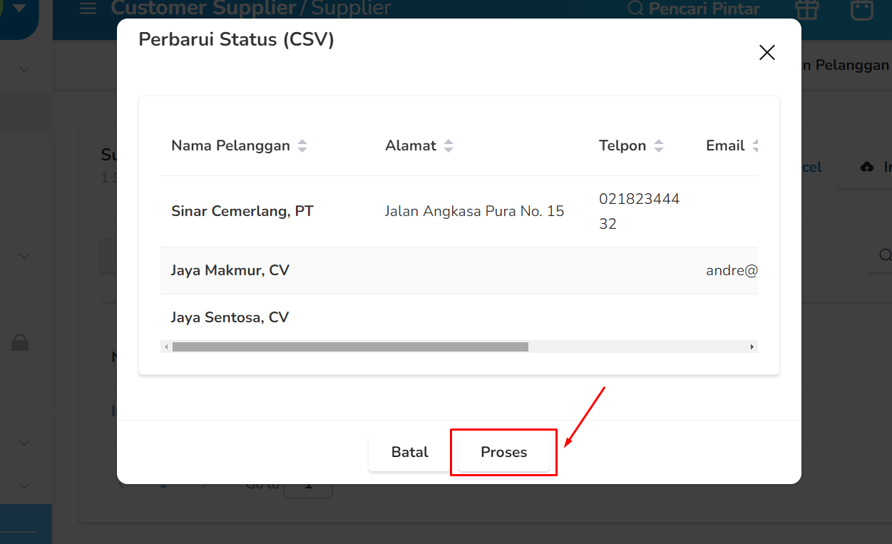 Klik tombol Proses untuk memulai import data. Sistem akan memproses data dan menambahkan supplier baru ke dalam sistem.