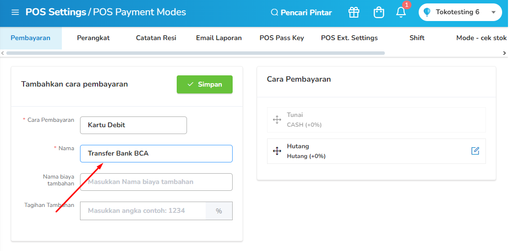 Setelah selesai mengisi informasi pembayaran, tekan tombol "Simpan" maka penambahan metode pembayaran baru sudah berhasil.