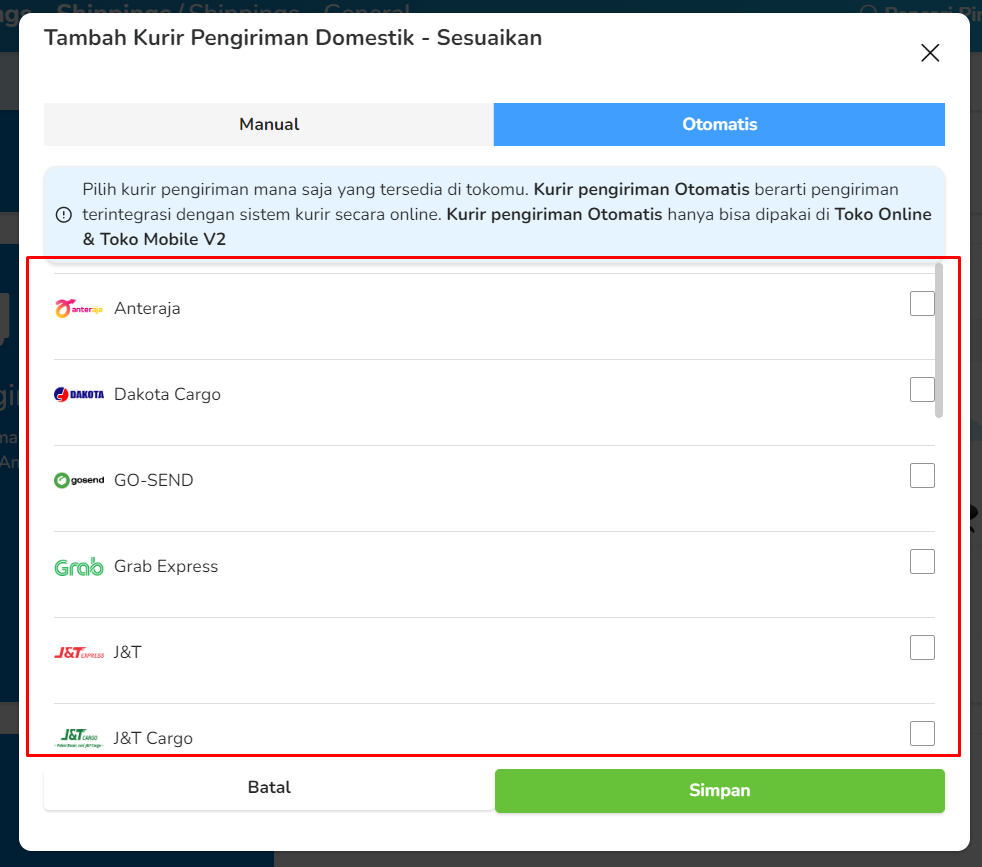 Pilih opsi Otomatis untuk menggunakan layanan pengiriman yang terintegrasi secara otomatis dengan sistem.