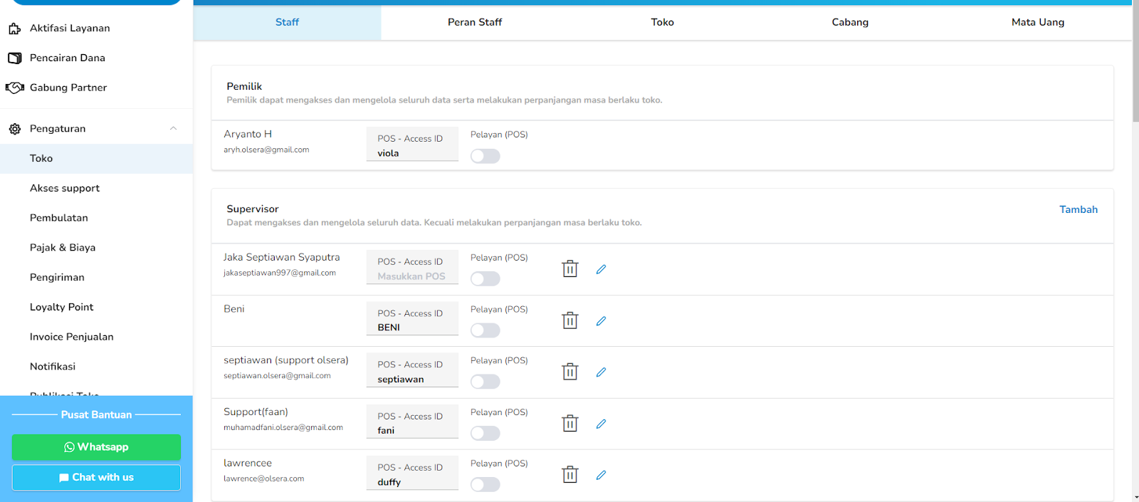 Menambahkan staff sebagai Supervisor di Olsera memungkinkan Anda memberikan akses khusus kepada staff untuk mengelola backoffice atau POS sesuai peran yang ditentukan. Berikut adalah langkah-langkah untuk menambahkan staff sebagai Supervisor: