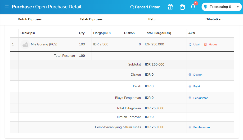 Status Pembelian: pada status tunda, berati produk yang dibeli belum dikirim ke toko, jika barang telah sampai ke toko maka perlu diganti ke status diterima.