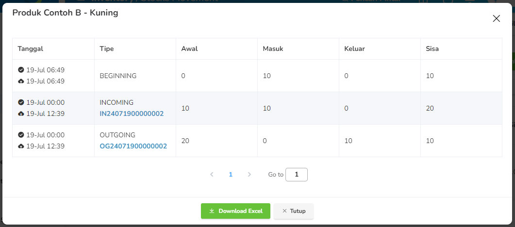 Anda bisa melihat detail waktu dan detail transaksi yang menyebabkan perubahan stok. Apabila transaksi yang diinginkan tidak ditemukan, pastikan filter tanggal telah tepat dan mengaktifkan lacak inventori.