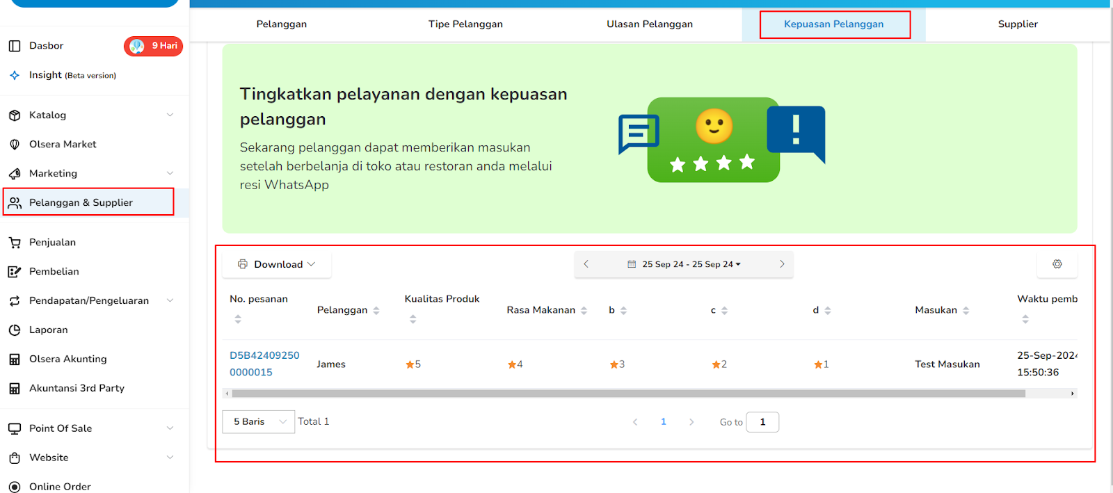 Untuk memantau hasil penilaian kepuasan pelanggan, buka kembali backoffice Olsera. Masuk ke menu Pelanggan & Supplier lalu pilih Kepuasan Pelanggan untuk melihat laporan penilaian yang telah diberikan oleh pelanggan.