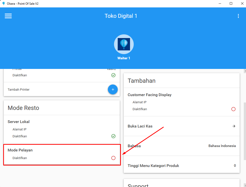 Pada menu pengaturan, cari opsi Mode Pelayan atau Mode Waiter.