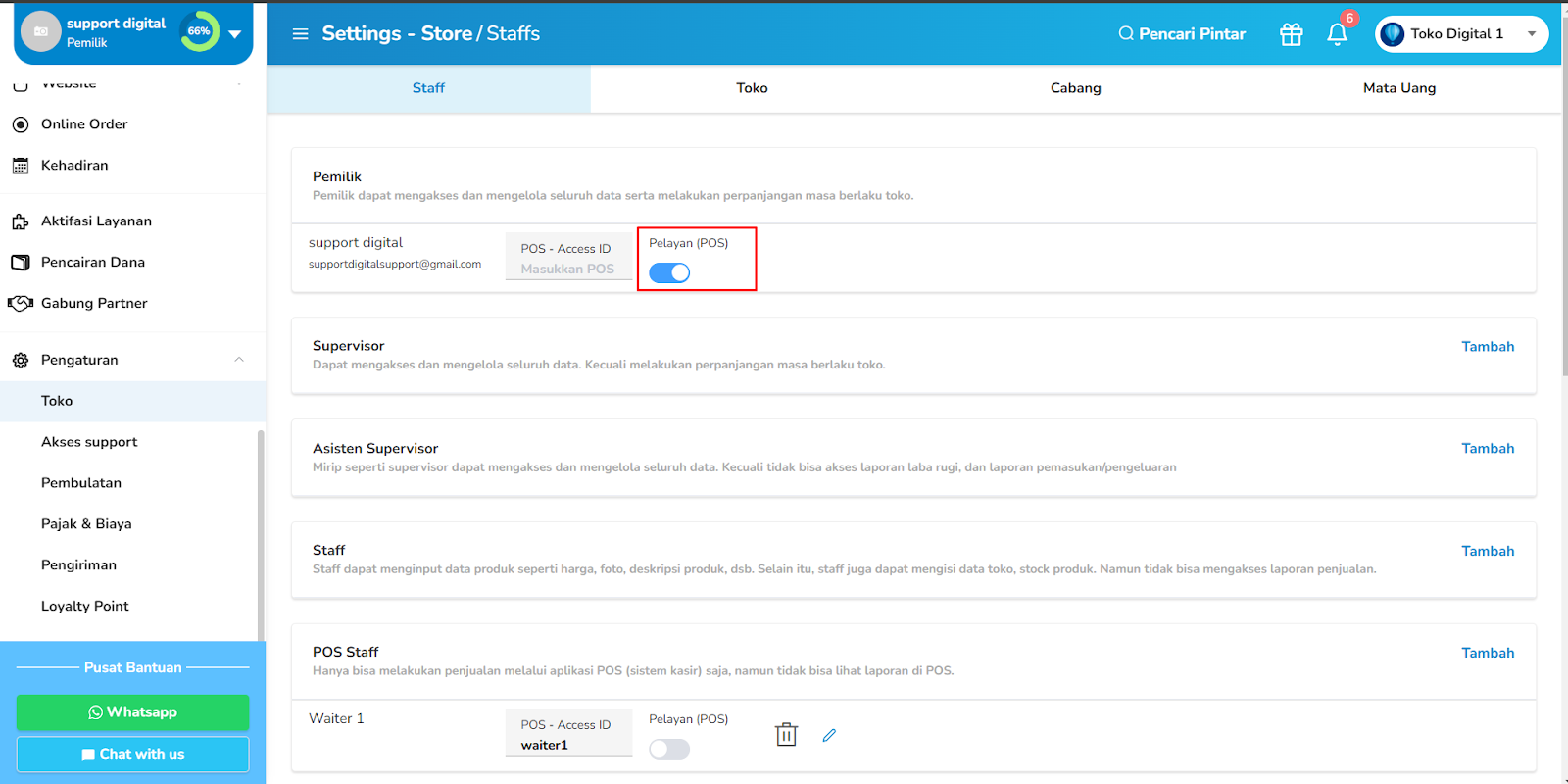 Aktifkan Fitur Lacak Pelayan di Backoffice Langkah pertama adalah memastikan bahwa fitur Lacak Pelayan telah diaktifkan di Backoffice Olsera. Caranya:- Masuk ke Backoffice Olsera, buka Point of Sale > Pengaturan POS.