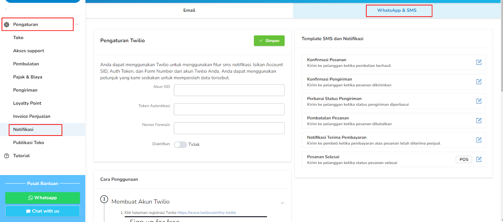 - Pertama, login ke backoffice Olsera, kemudian navigasi ke Pengaturan > Notifikasi > WhatsApp & SMS.