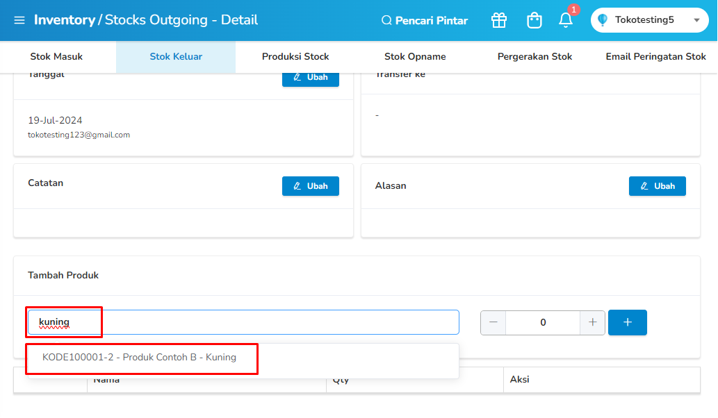 Tekan pada kolom "Tambah Produk" dan ketik nama produk yang ingin di kurangi stoknya, setelah muncul produk yang dicari, tekan pada nama barang yang muncul. - Masukan Qty Produk