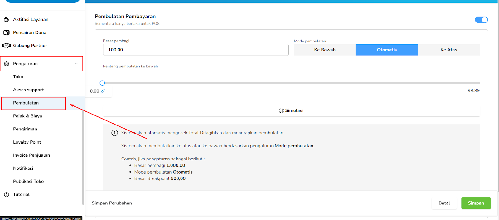 Pada halaman pengaturan pembulatan, Anda bisa memilih untuk mengaktifkan atau menonaktifkan fitur pembulatan sesuai dengan kebutuhan bisnis.