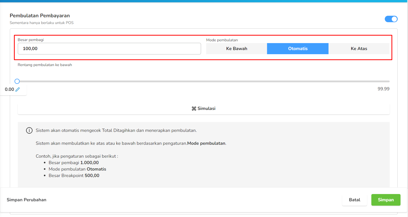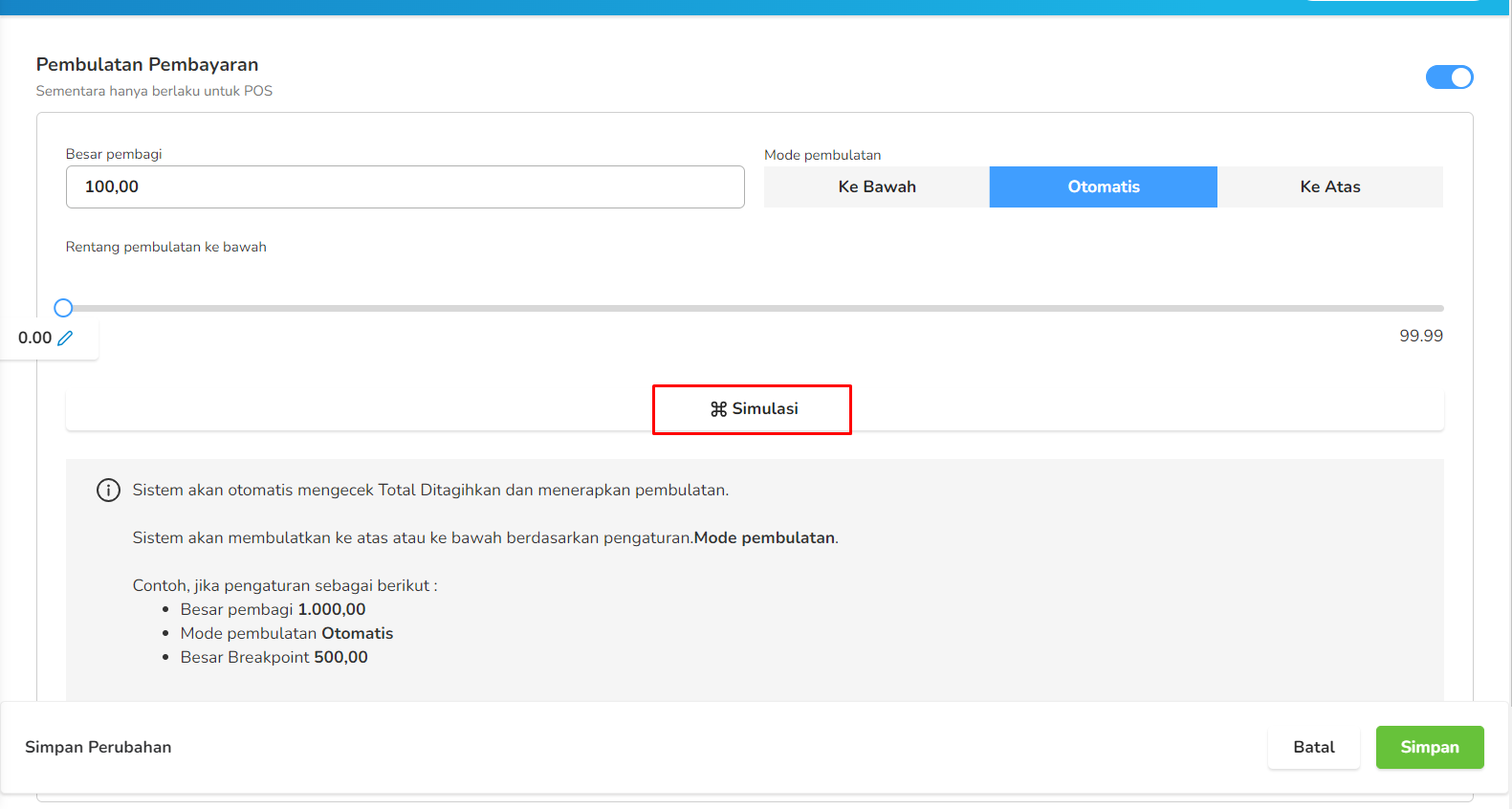 Sebelum menjalankan pengaturan di POS, Anda dapat melakukan simulasi untuk melihat hasil pembulatan yang akan diterapkan dalam transaksi.