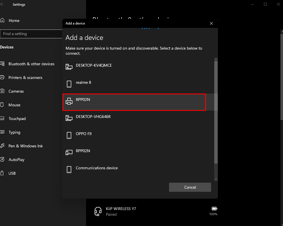 Pilih Perangkat Printer Bluetooth Saat daftar perangkat muncul, cari perangkat printer Bluetooth Anda, biasanya dengan nama RPP02N.