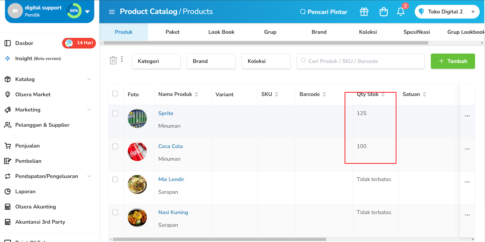 Setelah sinkronisasi selesai, periksa kembali stok di POS Olsera. Stok seharusnya sudah sama dengan yang ada di Backoffice Olsera.