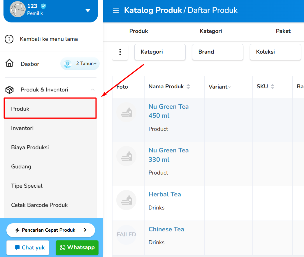Masuk ke menu Produk & Inventory kemudian pilih menu Produk